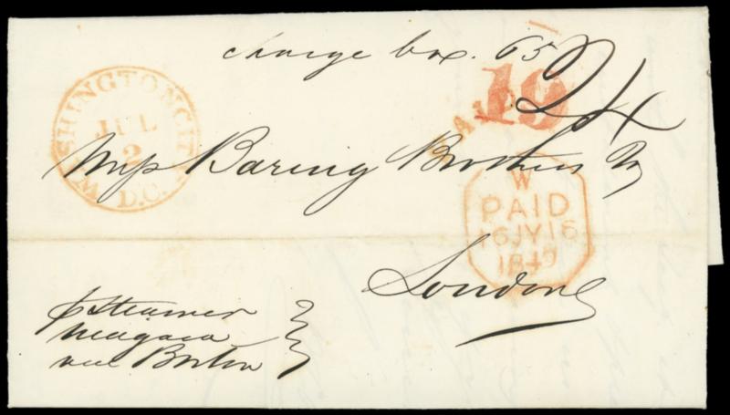 Symbol:1849 (Jul. 2) Washington D.C. to London, England. Folded letter with red "Washington D.C. Jul 2" cds with matching "Paid" straightline and ms. "24" cent rating, ms. "charge box 65" notation, Boston red " credit handstamp, carried as endorsed by Cunard Line Niagara from Boston Jul. 4th to Liverpool arriving Jul. 15th, red London Paid (7.16) arrival, fresh and Very Fine. Estimate; $75 - 100. US$75-100 (Image)