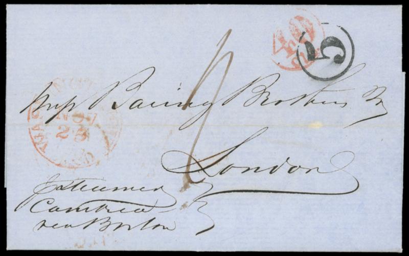 Symbol:1850 (Nov. 25) Washington D.C. to London, England. Blue folded letter with partial red "Washington City D.C. Nov 25" cds and matching "40 cts." in circle rating handstamp, Boston "5" debit handstamp, carried by Cunard Line Cambria from Boston Nov. 27th to Liverpool arriving Dec. 11th, red London (12.12) arrival backstamp and ms. "1/" schilling due rating, letter concerns the U.S.'s need for additional $50,000, Very Fine and scarce 40¢ rating handstamp,ex-Koppersmith. Estimate; $100 - 150. US$100-150 (Image)