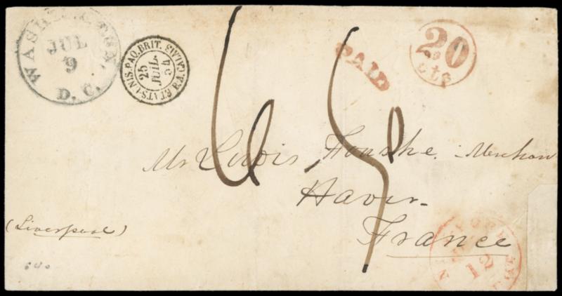 Symbol:1854 (Jul. 9) Washington D.C. to Havre, France. Cover with "Washington D.C. Jul 9" cds and red arc "Paid" with "20 cts" in circle handstamp, endorsed via "Liverpool", red "New-York, Jul 12" exchange cds, sent by Cunard Line Europa from New York Jul. 12th to Liverpool arriving Jul. 23rd, Calais (7.25) entry cds with "6" decimes due rating, Le Havre (7.25) arrival backstamp; refolded, small flaws, Fine and scarce 20¢ rating handstamp,ex-Karlin, Koppersmith. Estimate; $75 - 100. US$75-100 (Image)