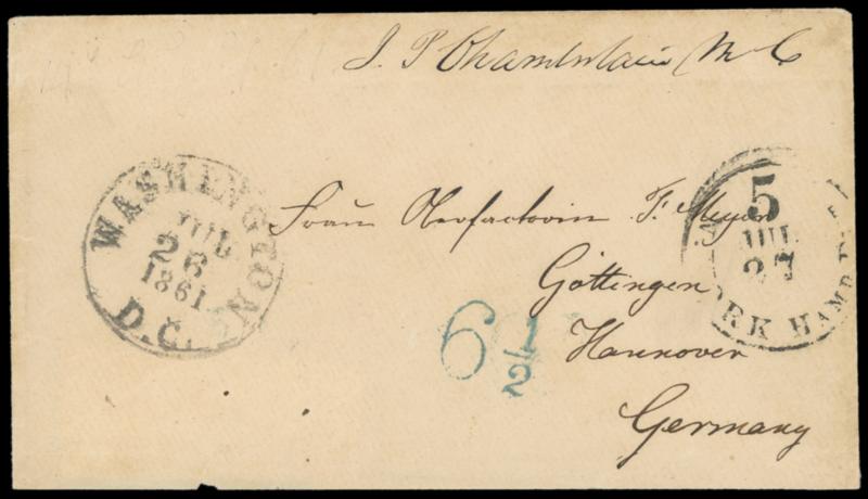 Symbol:1861 (Jul. 26) Washington D.C. to Hannover, Germany. Buff cover with "J.P. Charmberlain, M.C." free frank as U.S. Representative, entered mails with "Washington D.C., Jul 26, 1861" cds, "N. York, Hamb. Pkt. '5' Jul 27" debit exchange cds, carried by HAPAG Saxonia from New York Jul. 27th to Hamburg arriving Aug. 10th, Hamburg (8.10) transit backstamp and blue "6½" sbr rating handstamp, Gottingen (8.11) arrival backstamp; tiny edge tear at bottom, otherwise Very Fine and scarce free frank use to Germany. Estimate; $150 - 200. US$150-200 (Image)