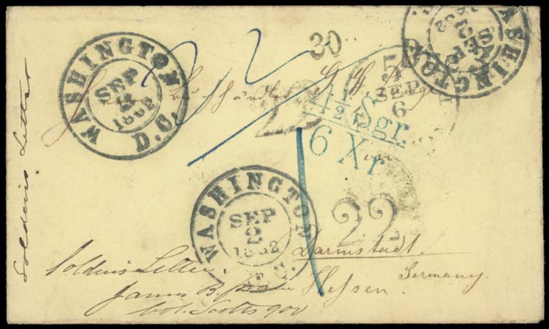 Symbol:1862 (Sep 2) Washington D.C. to Darmstadt, Germany. Yellow cover endorsed "Soldier Letter" at left with three strikes of "Washington D.C., Sep 2, 1862" cds with matching small "30" rating handstamp, partial "N.York, Hamb. Pkt. '5' Sep 6" debit exchange cds, carried by HAPAG Teutonia from New York Sep. 6th to Hamburg arriving Sep. 22nd, Hamburg (9.22) oval backstamp with matching "22" handstamps, blue "4½ Sgr./6 Xr." two-line handstamp, blue ms. "22/1" rating, Sep. 23rd arrival backstamp, Very Fine. Estimate; $150 - 200. US$150-200 (Image)