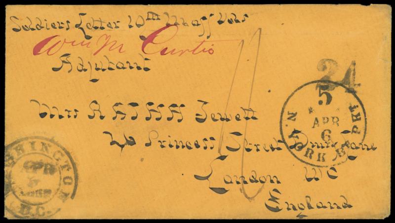Symbol:1864 (Apr. 5) Washington, D.C. to London, England. Cds with matching "24" due rating on orange cover endorsed "Soldiers Letter 10th Mass Vols, Adjutant" and signed "Wm M Curtis" in red manuscript, black "N. York Br. Pkt. '5' Apr 6" debit exchange cds, carried by Cunard Line China from New York to Queenstown arriving Apr. 17th, London manuscript "1/-" shilling due rating for the transatlantic packet fee, docketed as received April 18th, Very Fine and rare transatlantic soldier's letter. Estimate; $200 - 300. US$200-300 (Image)