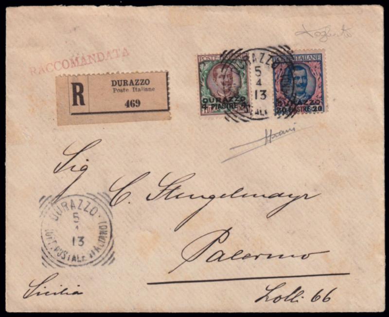 DURAZZO UFFICIO POSTALE ITALIANO. Lettera raccomandata spedita a Palermo in data 5/1/1913 ed affrancata con due valori soprastampati fra cui il raro 20 piastre su 5 lire ed il 4 pi. su 1 lira (Sassone 7+8). Timbro di arrivo. Firma di garanzia Sorani. (Image)