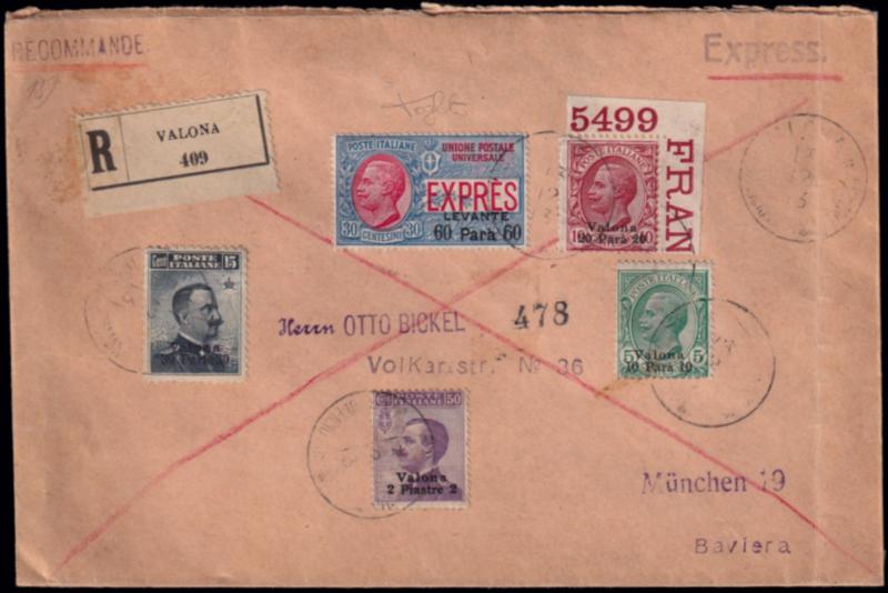 NUMERO DI TAVOLA 5499. Lettera raccomandata espresso spedita da Valona per Monaco di Baviera il 13/12/13 affrancata con 5 francobolli soprastampati Valona e valore locale ed il raro espresso da 60 para su 30 centesimi delle Emissioni generali (Sassone 2). Timbro di arrivo. Insieme impreziosito dal numero di tavola del valore da 20 para su 10 centesimi. (Image)