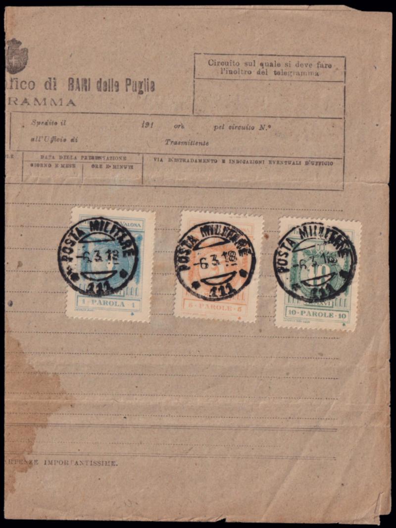 1918 FRANCOBOLLI TELEGRAFICI. I tre valori da 1 parola, 5 parole e 10 parole, rispettivamente blu, ocra e verde applicati su telegramma ed annullati col guller "Posta Militare 111" datato 6/3/18. Rari. Allegato ritaglio di rivista filatelica dell'epoca con la notizia della scoperta dei valori bollati telegrafici. (Image)
