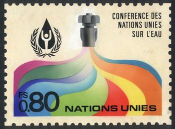 Unadopted artist design (year 1977) for the issue "Conference Des Nations Unies sur L'Eau" (FS.1.10 stamp, Sc.66), designed by A. Medina Medina, excellent quality, only known example! (Image)
