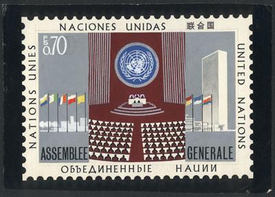 Unadopted artist design (year 1978) for the issue "Assemblee Generale" (FS.0.70 stamp, Sc.79), designed by A. Medina Medina, excellent quality, only known example! (Image)