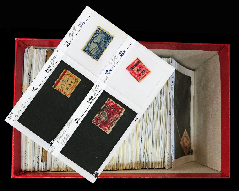 (#11/1612) USA MINT & USED STOCK 1852-1970's, 460 better stamps on dealer 102 cards in half a red box, includes better used #394 pair, 423, 456, 500, E1, Q11-Q12 ++, also mint #325, 1909, 2122, 2541, 2544A, E4, RW10, RW19 ++, also some Hawaii, Canal Zone, Micronesia, Offices in Shanghai, lots of Washington-Franklin issues, the odd minor fault and a few miss-identified stamps not counted, Scott cat over $4200 US ($5800 CDN), F-VF est ($150+ US) (Image)
