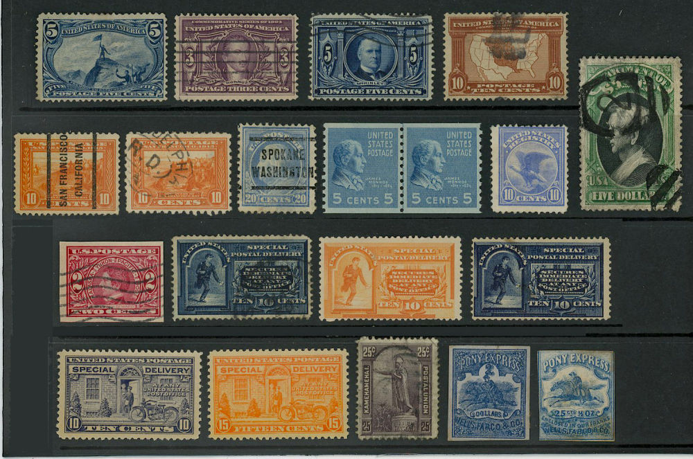 (#65/572) USA COLLECTION BALANCE 1864-1959, 238 stamps including used #230/572 (x23), MNH #784/2441 (x110), BOB used #E2, E11, O16, O69 (fake?), Juan-de-Fuca private post, and Wells Fargo Pony Express (fakes?), also BOB mint #E3, E5, E12-E13, E14/E19 (x28), F1, J52, J101, QE1, RV1, S7, 457, also Canal Zone mint #87/159 (x9), and #C3/C52 (x7), plus Hawaii MNG #30-31 and used #30/82 (x24), Scott cat over $1740 US ($2500 CDN), VG-VF est ($75+ US) (Image)