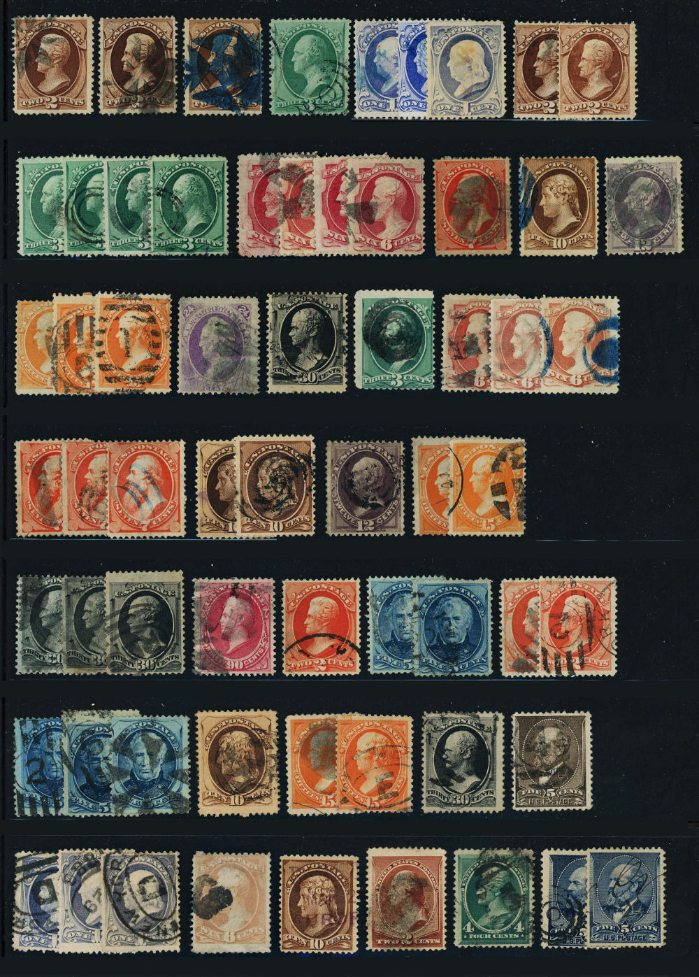 (#135A/216) USA USED BANKNOTE ISSUES 1870-1888, 63 better stamps noting #135A (I-Grill x3). 136A (I-grill), 145 (x3), 145 (x2), 147 (x4), 198 (x4), 148 (x4), 149-151, 152 (x3), 153-154, 158, 159 (x3), 160 (x3), 161 (x2), 162, 163 (x3), 165 (x3), 166, 178, 179 (x2), 183 (x2), 185 (x3), 188, 189 (x2), 190, 205, 206 (x3), 208-211, 216 (x2), lots of $200-$300 items, total Scott cat over $4785 US ($6800 CDN), F-VF est ($200+ US) (Image)