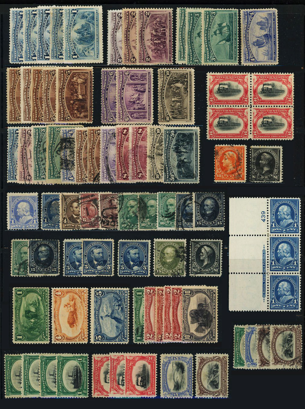 (#230/298) USA MINT & USED 1893-1901, 80 stamps including Columbus issue mint #230 (x5), 231 (x3), 232 (x3), 233, 234 (x5), 235 (x2), 237, also used Columbus #230-237, 240, Bureau mint #246, 264, 281 and Bureau used #247, 254, 256-257, 258 (x3), 259 (x2), 260-261, 261A, 273-274, 281 (x2), 284, Trans Mississippi mint #285, 287-288, used #290, Pan-Am mint #294 (x4), 295 (x7), 297-298, and used #294, 297, 298 (x2), note better up to $800 items, total Scott cat over $3378 US ($4800 CDN), F-VF est ($200+ US) (Image)
