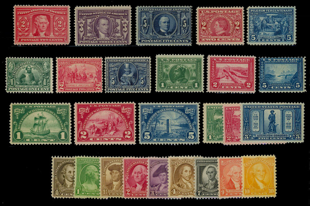 (#325/765) USA MINT COMMEMORATIVE STOCK 1904-1935, 130 stamps with 1-5 of each stamp, mostly MNH and priced on dealer 102 cards, Scott cat over $2024 US ($2900 CDN), F-VF est ($100+ US) (Image)