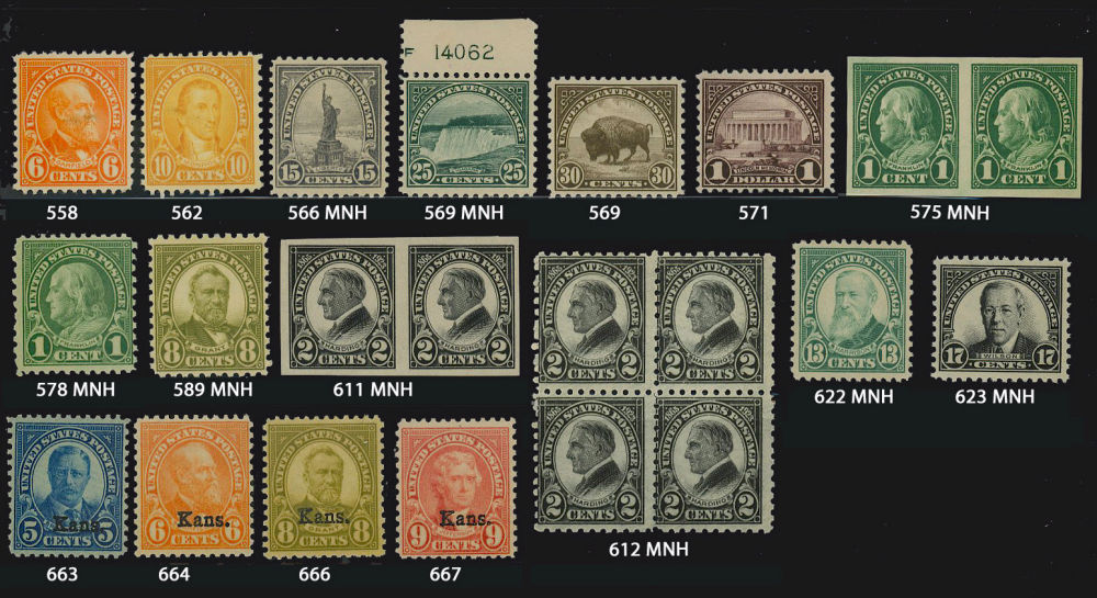 (#551/723) USA PRESIDENTIAL MINT STOCK 1922-1932, 162 stamps mostly MNH with 1-2 of each stamp, includes 551-554 (x8), 552A, 556-559 )x5), 561-566 (x4), 568-569 (x3), 571 (x2), 576-577 (x3), scarce 578 MNH, 597/723 (x126), Scott cat over $1325 US ($1900 CDN), F-VF est ($75+ US) (Image)