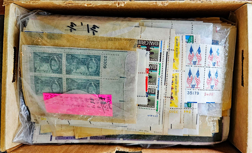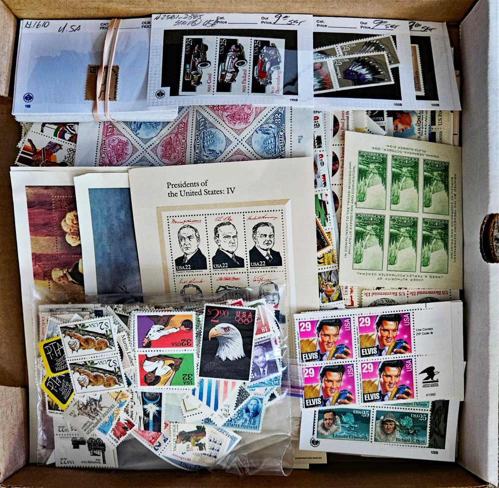 (#1581/2550) USA MINT STAMPS 1975-1990's, 8000 MNH stamps in blocks, plate blocks, souvenir sheets, and 1100 single stamps on 50 dealer 102 cards and a plastic bag, lots of nice sets and denominations up to $12.90, huge Scott cat over $3000 US ($4300 CDN), face value $1400 US ($2000 CDN), VF est ($200+ US) (Image)