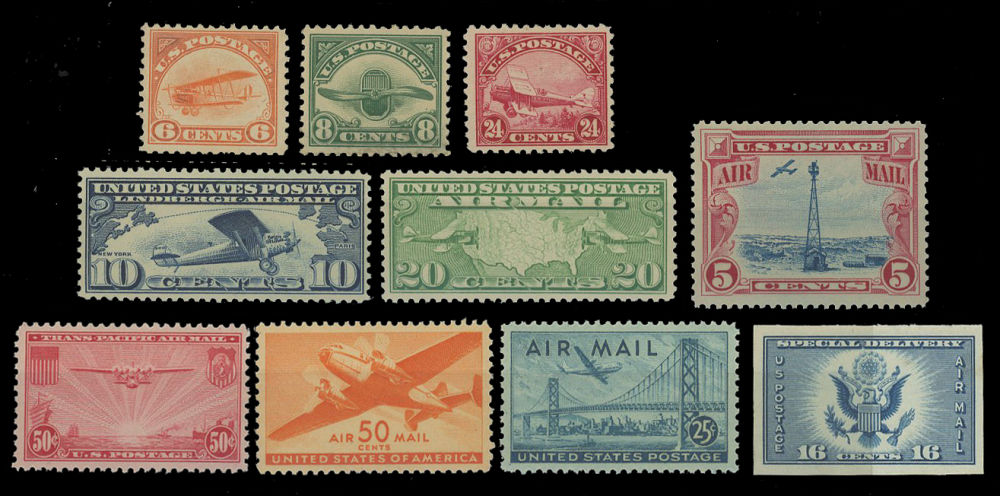 (#C1/C119) USA AIRMAIL MINT STOCK 1918-1988, 175 mostly MNH stamps including better #C1, C4 (x4), C6 (x2), C7-C9 (x12), C10 (x10), C11-C12, C16 (x3), C17 (x3), C19 (x10), C23 (x4), C20-C22 (x8), C25-C31 (x34), C13 (x15), C34-C36, C37 (x7), C46 (x5), C52/C119 (x52), lot includes a few used noting #C4, C6 (perfin), and C20, Scott cat over $815 US ($1160 CDN), F-VF est ($50+ US) (Image)