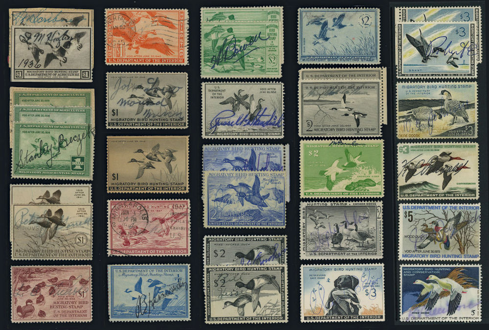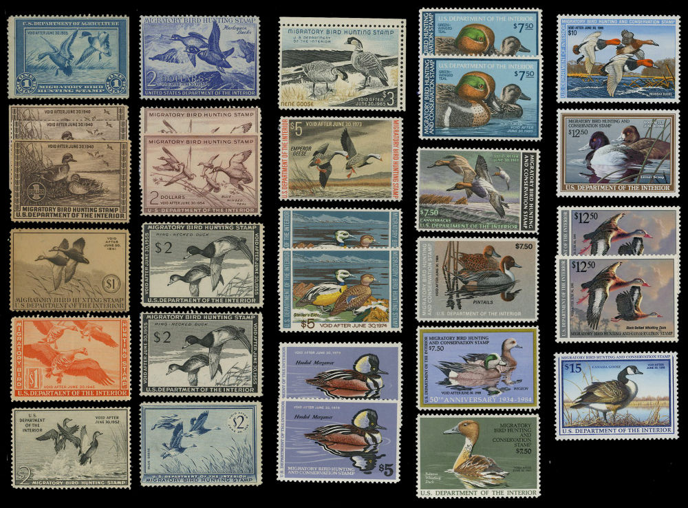 (#RW1/RW64) USA MINT DUCK STAMP STOCK 1934-1997, 30 stamps with 1-3 of each stamp, includes RWI (MNG), #RW6-RW7, RW11, RW18-RW21, then #RW22/RW64, includes MNG, MLH, MDG, and MNH, Scott cat over $1532 US ($2200 CDN), F-VF est ($150+ US) (Image)