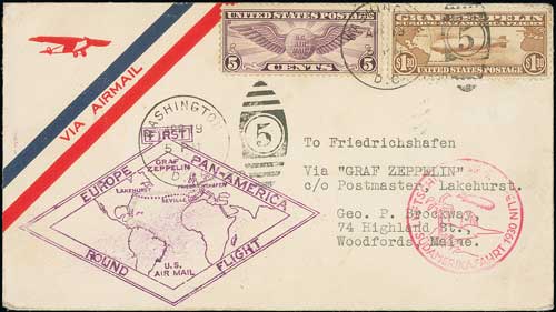 1930 (Apr 19) Cover from Washington D.C carried on the round flight between Lakehurst and Friedrichshafen, with the Round Flight and South American flight cachets, franked by Air 5c and Graf Zeppelin $1.30, the First Day of Issue of this Zeppelin stamp, backstamped at Friedrichshafen (June 6) and New York (June 18). A fine and scarce First Day Cover. S.64. Photo on Page 246. (Image1)
