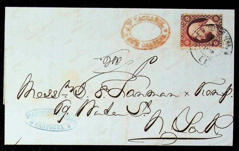 USA 1859 Washington 3c on cover w/ contents from Campeche Mexico via New Orleans to New York w/ Forwarding Agent's seal (Image)