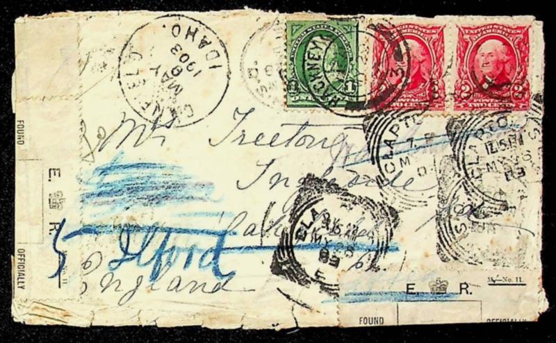 USA 1903 1c+ 2c pair on well-travelled redirected Officially Sealed cover to England (Image)