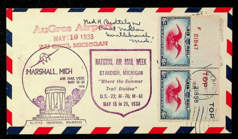 USA 1938 6c pair w/ plate on National Airmail Week, Standish Michigan cover (Image)