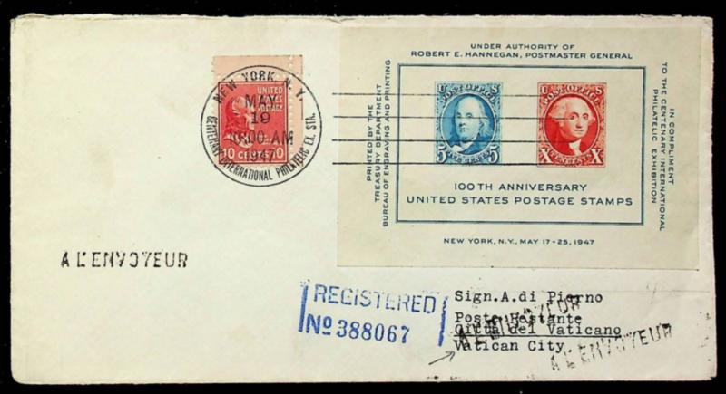USA 1947 100th Anniversary Postage Stamps 2v Imperf MS+ 10c on Regd cover from New York to Vatican w/ "RETOUR A L'ENVOYEUR" cachet (Image)