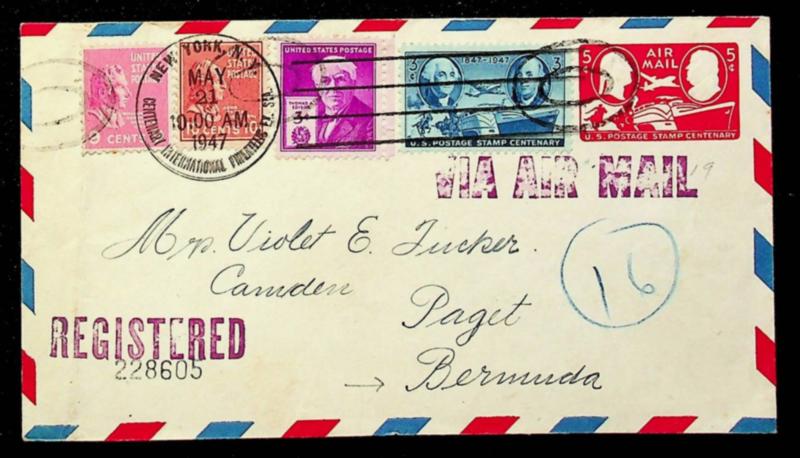 USA 1947 100th Anniversary Postage Stamps 2v Imperf MS+ 4v uprated on Regd airmail 5c envelope from New York to Bermuda (Image)