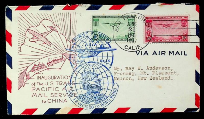USA 1937 2v on Trans-Pacific Airmail FFC from San Francisco California via Hong Kong China/ Sydney Australia to New Zealand (Image)