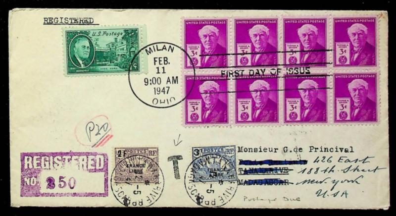 USA 1947 Thomas Edison 3c block of 8+ 4c on Taxed Regd cover from Milan Ohio to Madagascar & returned to New York w/ Postage Due France Libre 2v w/ s/c (Image)
