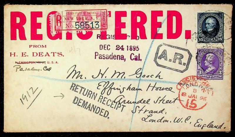 USA 1895 2v on Regd cover w/ framed "AR" & "Return Receipt Demanded" cachets from New York to London England (Image)
