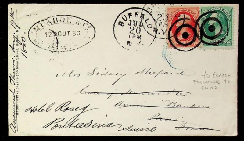 USA 1880 2v on cover w/ concentric cancel from Buffalo NY to France redirected to Switzerland w/ Forwarding Agent's seal (Image)