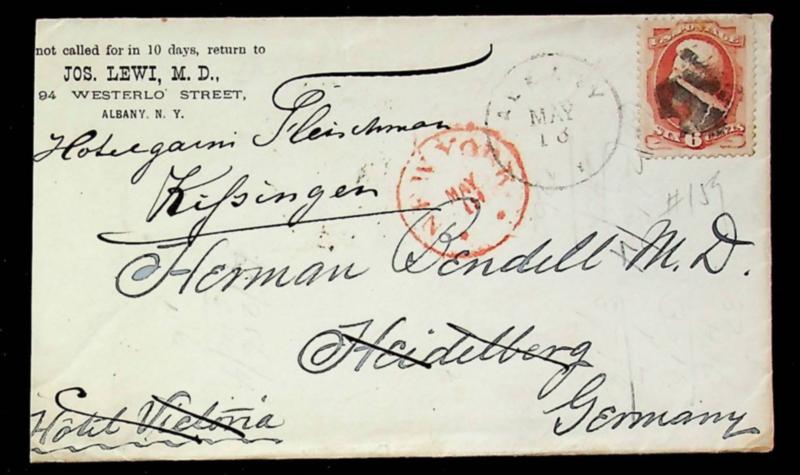 USA 6c on cover from Albany NY to Hotel Victoria Heidelberg Germany redirected to Kissingen (Image)