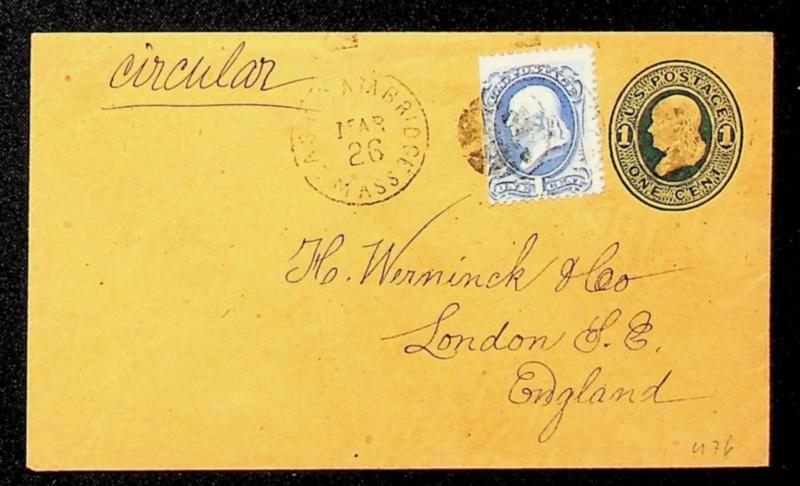 USA 1873 1c uprated on Franklin 1c env from Cambridge Massachusetts to London England (Image)