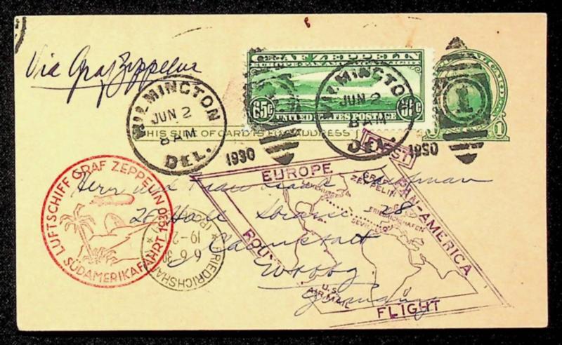 USA 1930 65c uprated on 1c postcard w/ "EUROPE PAN-AMERICA ROUND FLIGHT" violet cachet via Graf Zeppelin to Germany (Image)