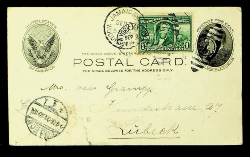USA 1904 McKinley 1c postcard uprated by 1c from Woodhaven, New York to Lubeck Germany (Image)