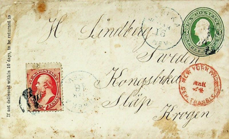 USA 7c uprated on 3c envelope from New York to Krogen Sweden (Image)