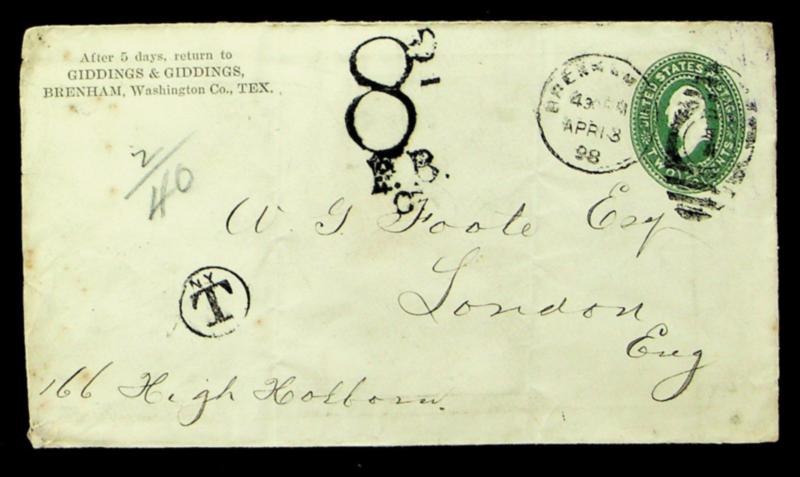 USA 1898 2c on taxed envelope w/chargemark from Brenham to London GB (Image)