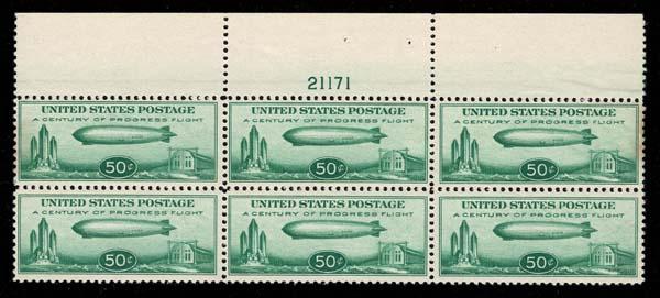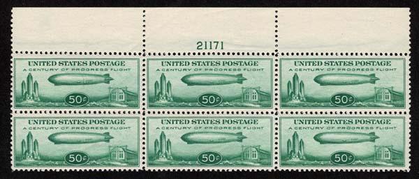 1933, 50¢ "Chicago" Zeppelin, green TOP PLATE BLOCK OF SIX, n.h., couple of gum skips, almost very fine (Scott C18). Scott $600 (Image)