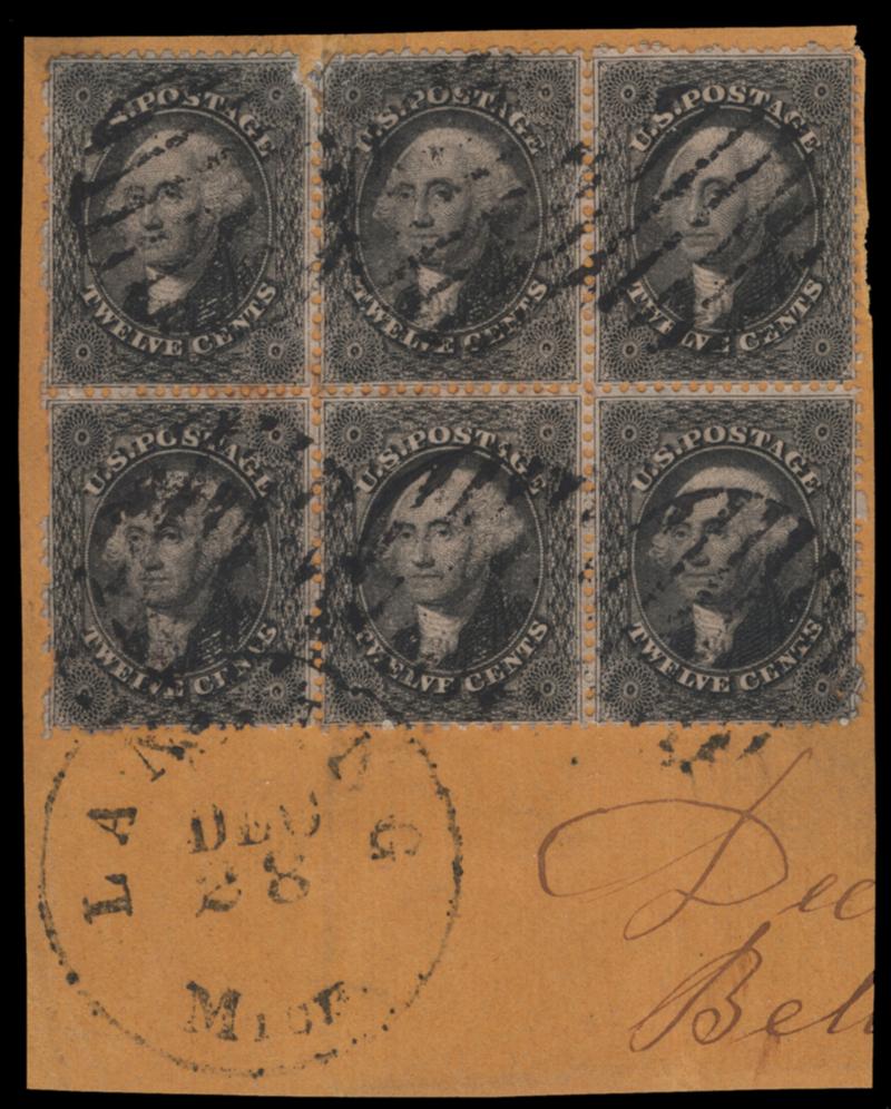 1857, 12c BLACK PLATE 1 BLOCK OF SIX USED ON PIECE, #36, tied by grids and matching Lansing, Mich d.s., faults incl. top left and bottom right stamps faulty, still an attractive and scarce classic multiple, overall fine, cat. $4,350.00 as block and pair (Image)
