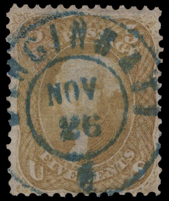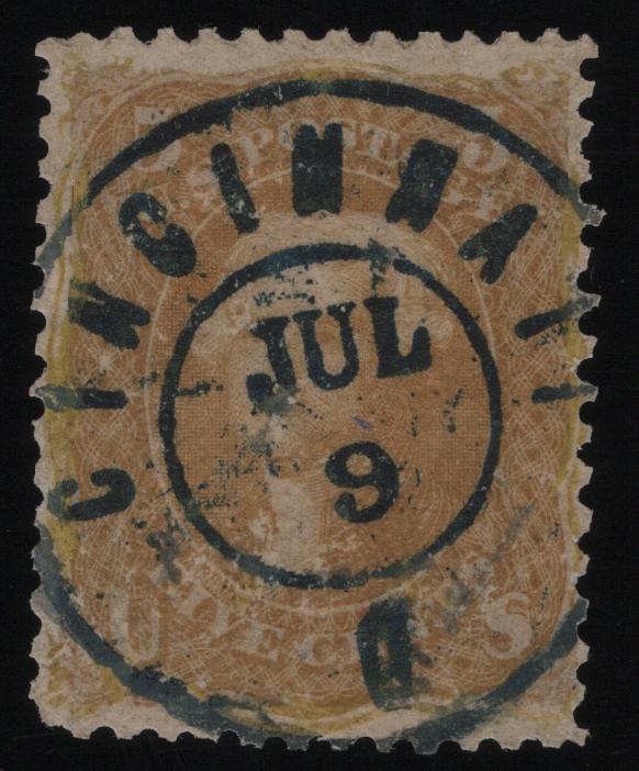1861, 5c OLIVE YELLOW WITH SOCKED-ON-THE-NOSE BLUE CINCINNATI DATESTAMP, #67b, nicely balanced margins, reperfed at bottom, fine-very fine, attractive example of a very scarce shade, with 2024 William T. Crowe cert., cat. $4,880.00 (Image)