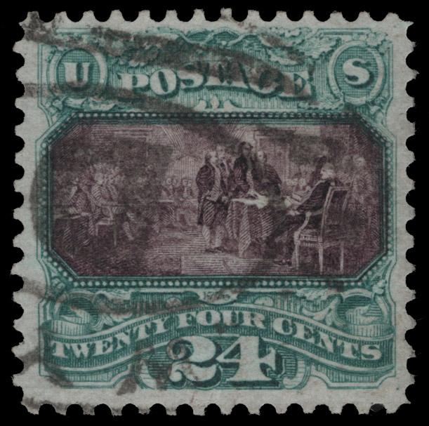 1875, 24c GREEN & VIOLET RE-ISSUE USED GRADED '90', #130, fresh and exceptionally well-centered, great colors and impressions, clear oval double ring registration cancel, extremely fine, ex. Saadi, with 1989 and 2018 P.F. cert., latter graded '90', SMQ $3,500.00 (Image)