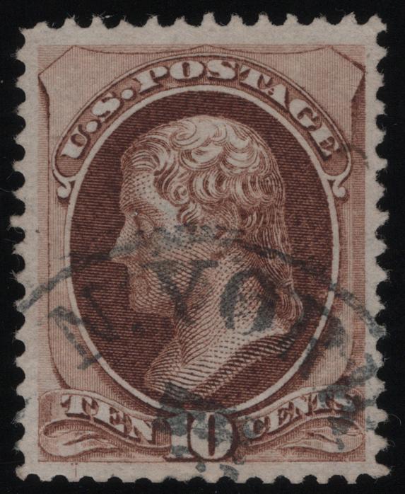 1870, 10c BROWN WITH STEAMSHIP CANCEL, #150, reperfed with small crease, still what a good looking stamp, with 2011 PSE cert., cat. $55.00 (Image)