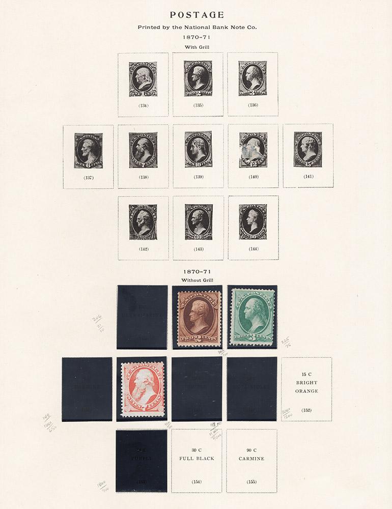 1870-87 MINT BANK NOTE ISSUES ON SCOTT PAGES, incl. nos. 146-47 regummed, 149 used (crease), 158 unused, 160 regummed, 161 regummed, 162 regummed, 178 regummed, 179 unused, 182 regummed, 183 o.g. hinged, 186 part. dist. o.g., 188 regummed, 189 o.g. hinged, tiny thin, 205 regummed, 206 o.g., hinged, 207 unused, 210 regummed, 211 o.g., slight crease, 212 unused and 213 o.g., thinned, also a group of perforated plate proofs on India in place of 1876 special printings, overall sound stamps except as mentioned, cat. $4,700.00 (Image)