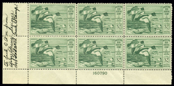 RW16(s), 1949 AMERICAN GOLDENEYE, SBA ROGER E. PREUSS, LOWER LEFT PLATE BLOCK OF 6 NO. 160790, sba in left selvage "To Jack O. Roe from/Roger Preuss, designer/1949 Federal Duck Stamp." Extremely RARE item! VF-XF NH (Image)