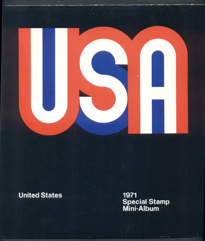 1396, 1423-45, USPS 1971 Special Stamp Mini-Album with stamps, F-VF NH, tri-fold folio, stamps in glassines, packet of hinges included, all commemoratives. Folio is slightly stained Cat($45) (Image)