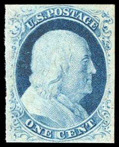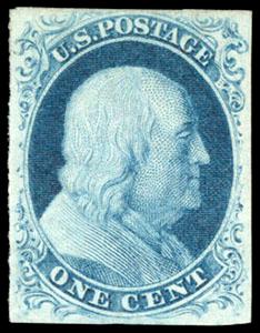 1851, 1¢ blue, type II. Cert. states, "part o.g." (which looks almost complete to us), four even margins, deep color, Very Fine to Extremely Fine, with 2006 P.S.E. certificate Graded (VF-XF 85, SMQ $1,400). Scott No. 7; $1,000. US$0 (Image)