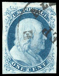 1851, 1¢ blue, type IIIa. Pos. 14R4 showing wide break at top, large margins to just shaving tip of scroll at bottom right, bright color and light town cancel, Very Fine and attractive, with 2013 A.P.S. certificate. Scott No. 8A; $800. US$0 (Image)
