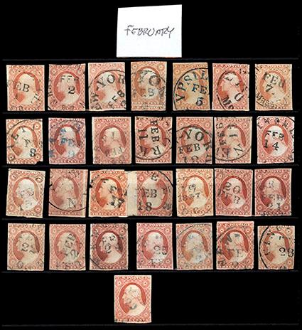 1851, 3¢ dull red, types I-II, Calendar. Stockbook arranged in calendar format, with the far majority bearing a clear central date stamp for 366 days of the year including Feb 29th (The year 1852 was leap year), each stamp hand-selected with many showing a upright date, please see our website for images, Very Fine for this, a nice complete 3¢ calendar. Scott No. 11-11A; Estimate $750 - 1,000.