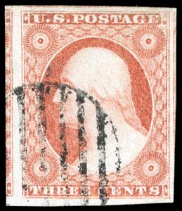 A STUNNING CORNER MARGIN SINGLE OF THE 1851 3¢ ORANGE BROWN ISSUE.