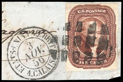1856, 5¢ red brown. Exceptionally large margins and fresh, rich color; tied on small piece by unusual oblong grid of square dots alongside a Calais, France entry c.d.s., Nov 3, 1856, Extremely Fine, with 1994 P.F. certificate. Scott No. 12; $750. US$0 (Image)