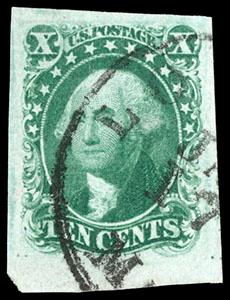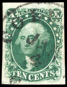 1855, 10¢ green, type I. Four large to huge margins, deep, intense color, light "Columbia, Cal." cds, Extremely Fine and choice, with 2023 P.S.A.G. certificate Graded (90). Scott No. 13; $750. US$0 (Image)